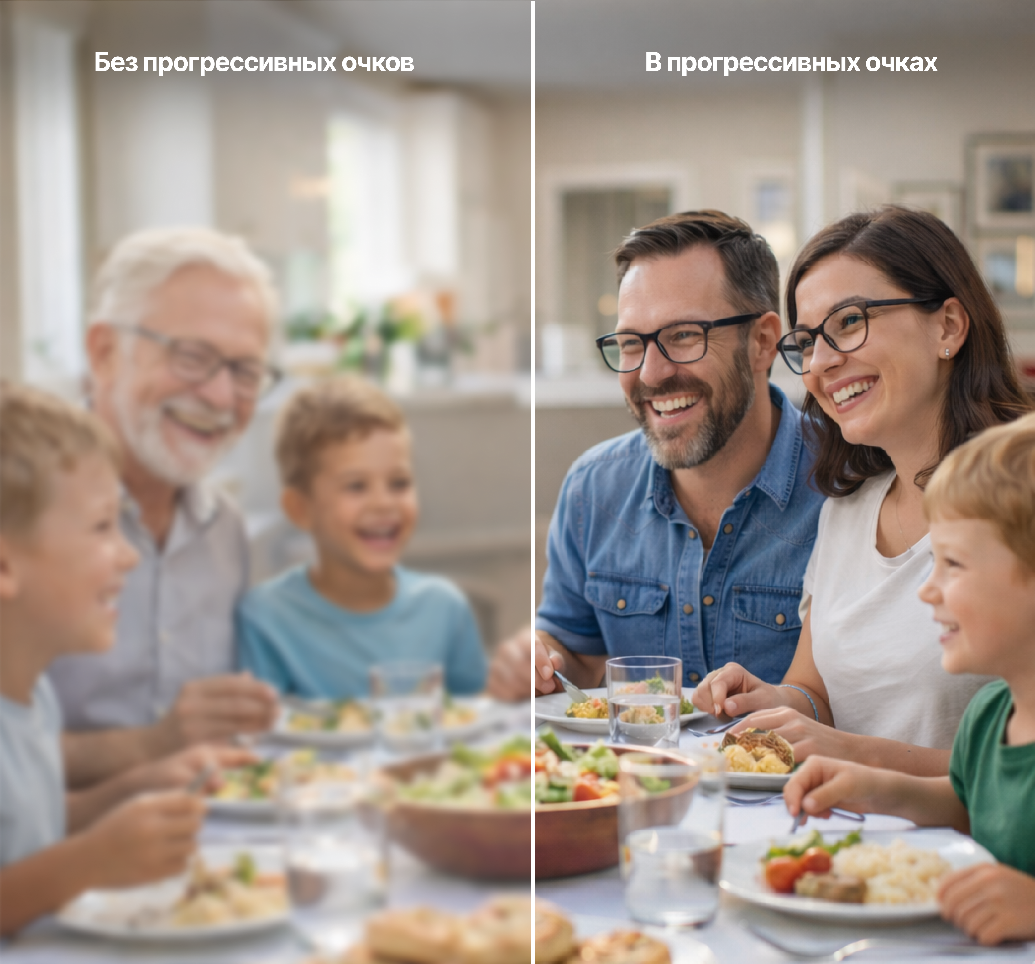 После 40 детали начинают уплывать: лица, ценники, сообщения. Прогрессивные линзы дают чёткость на любом расстоянии без смены очков.